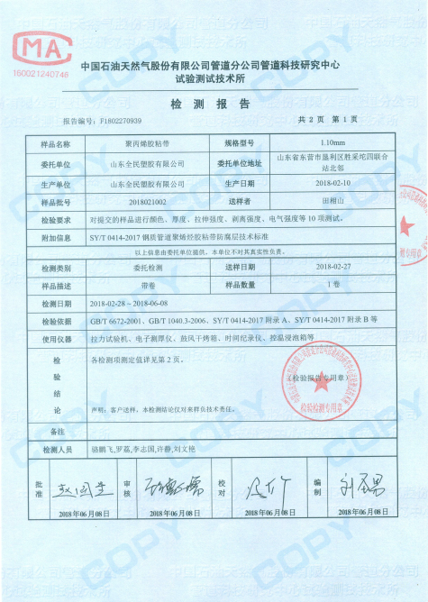 按照SY/T0414-2017要求,聚丙烯防腐膠帶的生產(chǎn)廠家應(yīng)為使用方,提供由國家認可實驗室,對其產(chǎn)品依據(jù)制造標(biāo)準(zhǔn),測試檢驗的性能指標(biāo)完全符合的報告。使用前對聚丙烯防腐膠帶的厚度、基材拉伸強度、對底漆鋼剝離強度、對背材剝離強度、電氣強度、體積電阻率,以及吸水率和水蒸氣透過率進行復(fù)檢,測試是否滿足要求,性能指標(biāo)達不到的杜絕使用。